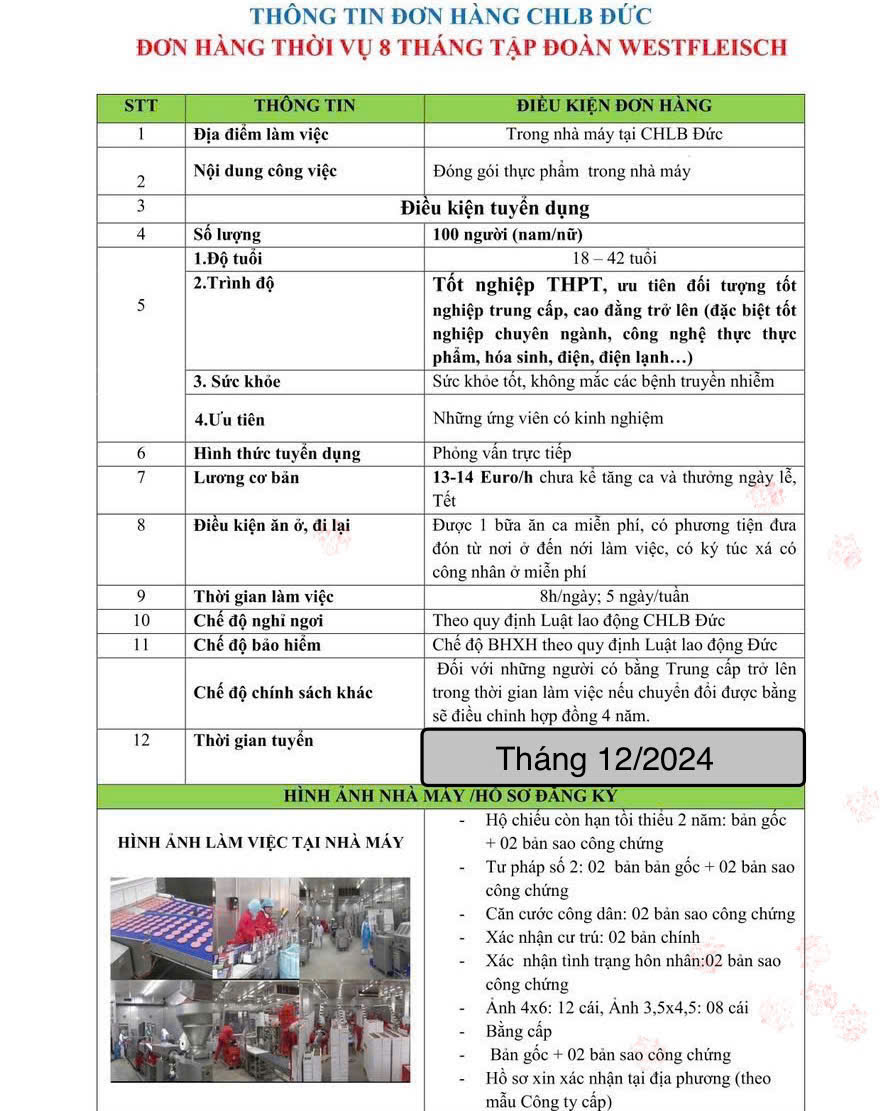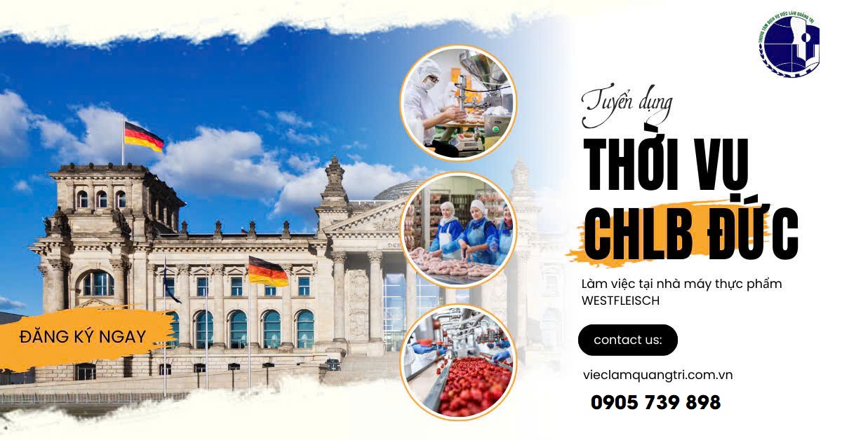 Trung tâm DVVL Quảng Trị triển khai chương trình lao động thời vụ tại CHLB Đức, làm việc trong tập đoàn thực phẩm hàng đầu với thời gian làm việc 8 tháng và có thể đi lại nhiều lần.