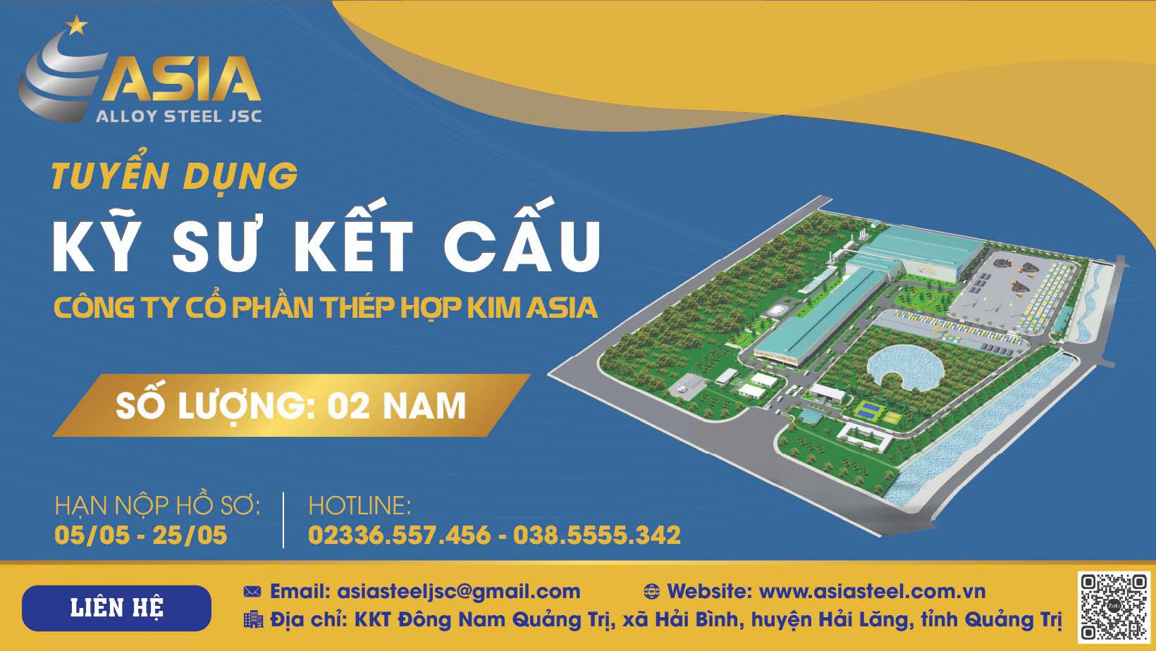 2. Quy trình ứng tuyển: Ứng viên nộp hồ sơ và phỏng vấn trực tiếp tại Dự án Nhà máy sản xuất Inox và Thép hợp kim ASIA Địa chỉ: Khu kinh tế Đông Nam Quảng Trị, Xã Hải Bình, Huyện Hải Lăng, Tỉnh Quảng Trị hoặc gửi Cv vào Email: asiasteeljsc@gmail.com.Điện thoại liên hệ:02336.557.456 hoặc 038.5555.342 (A. Cường TP.HCNS) Hạn nộp hồ sơ: từ 05/05/2025 đến 25/05/2025.