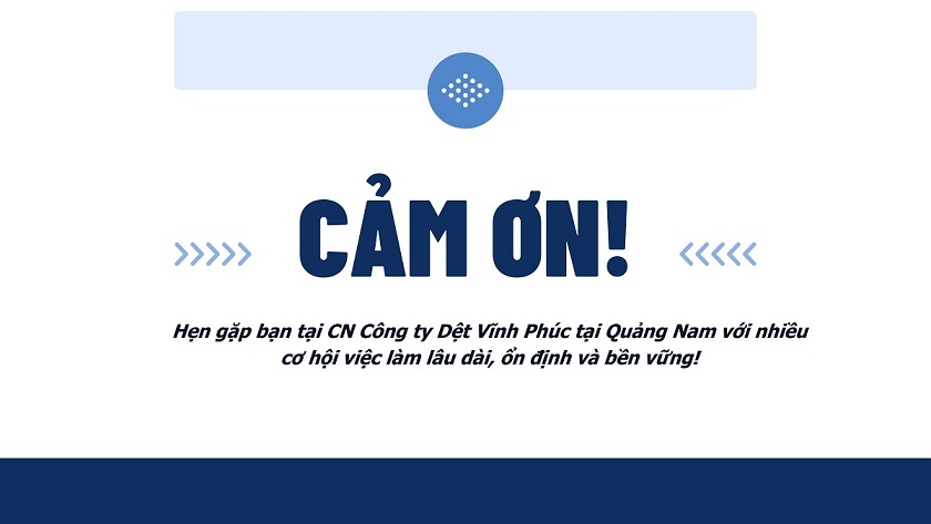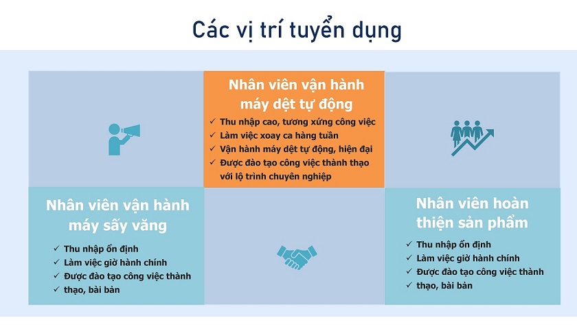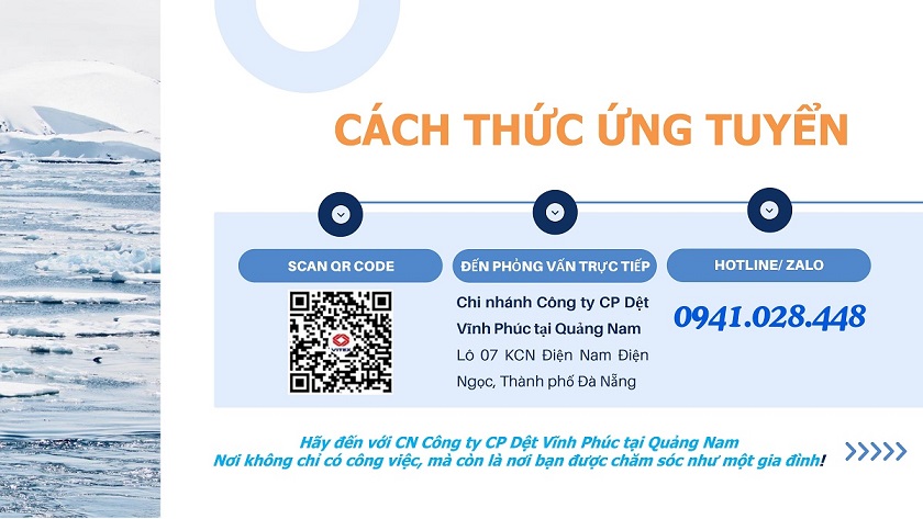 Chi nhánh Công ty cổ phần Dệt Vĩnh Phúc tại Quảng Nam tuyển gấp công nhân làm việc tại Nhà máy Dệt ở Khu Công nghiệp Điện Nam- Điện Ngọc, Đà Nẵng với nhiều chế độ ưu đãi, phúc lơi tốt