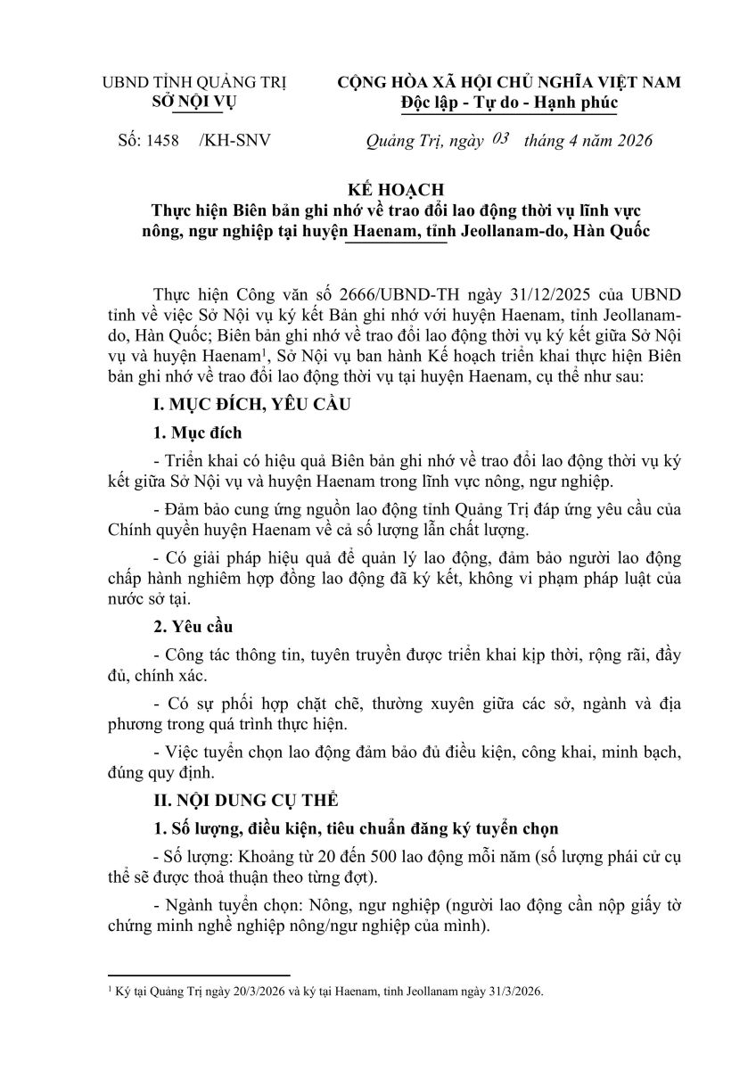 KẾ HOẠCH THỰC HIỆN BẢN GHI NHỚ VỀ TRAO ĐỔI LAO ĐỘNG THỜI VỤ LĨNH VỰC NÔNG, NGƯ NGHIỆP TẠI QUẬN JINDO, TỈNH JEOLLANAM-DO HÀN QUỐC (ĐỢT 1 -2026)